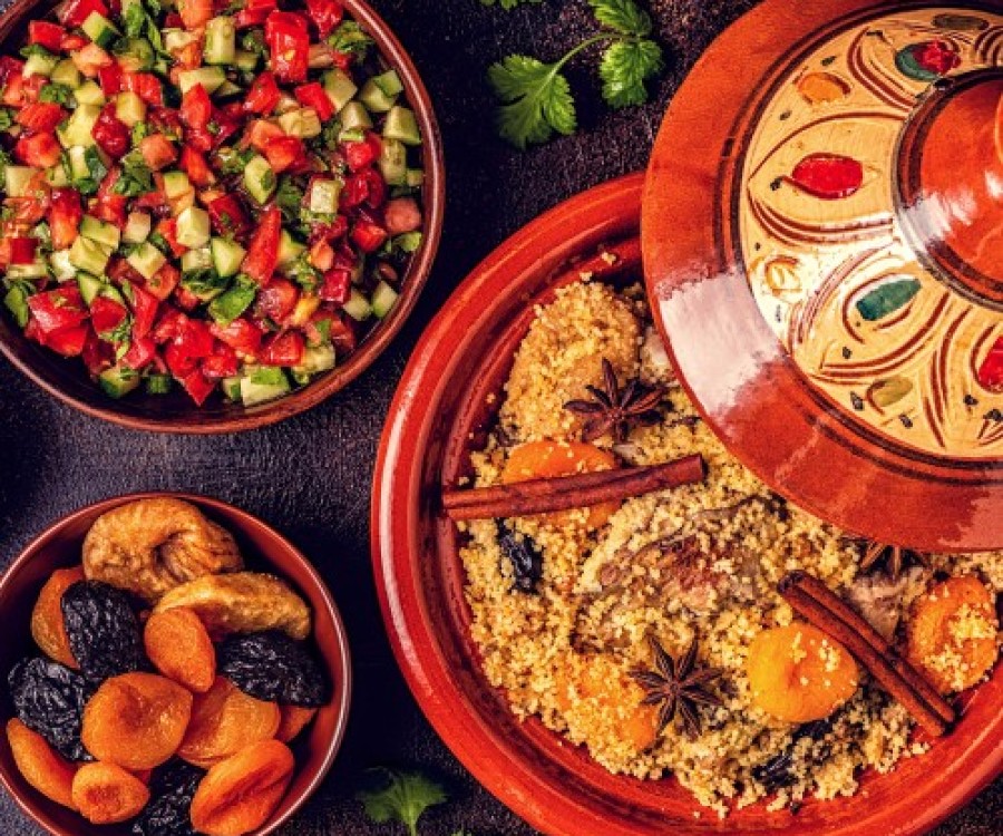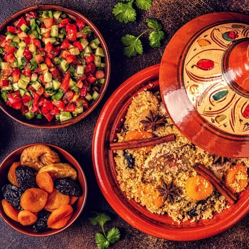 La gastronomía de Marrakech es una explosión de sabores. El hummus, el cuscús o el tajín son platos típicos que tendremos la oportunidad de probar.